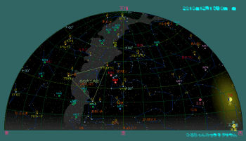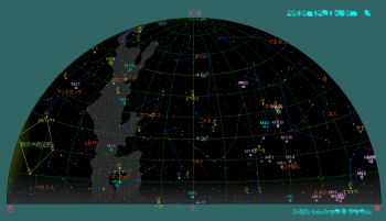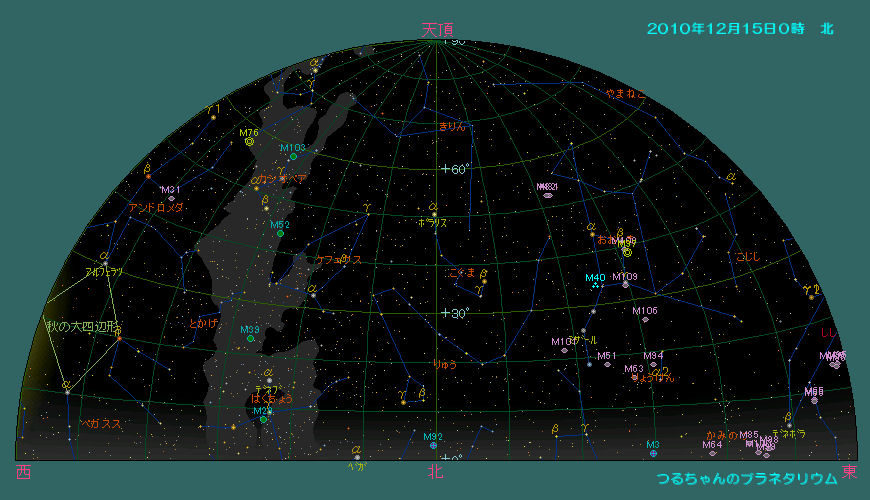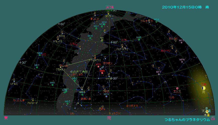 今月の日没後の星空はまだまだ秋の星座で一杯です。日没が午後4時頃なので、空が暗くなった西の空には未だ夏の星座も見えています。薄明が完全に終了する頃には賑やかな冬の星座が東の空に昇ってきます。オリオン座のベテルギウス、こいぬ座のプロキオン、天界で最も明るい恒星おおいぬ座のシリウスで構成させる冬の大三角が目立ちます。おおぐま座に有る北斗七星はひしゃくを北東の空に持ち上げ、北極星を挟んだその反対側にはカシオペア座が有ります。