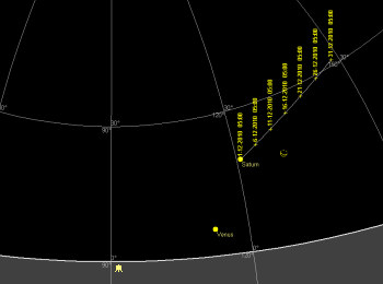 金星 4日に最大光度(-4.9度)に達する金星は明け方の空で最も明るい星です。視直径40.1秒角、日照面27%。月末に掛けて視直径は小さくなりますが、日照面は45%迄大きくなります。