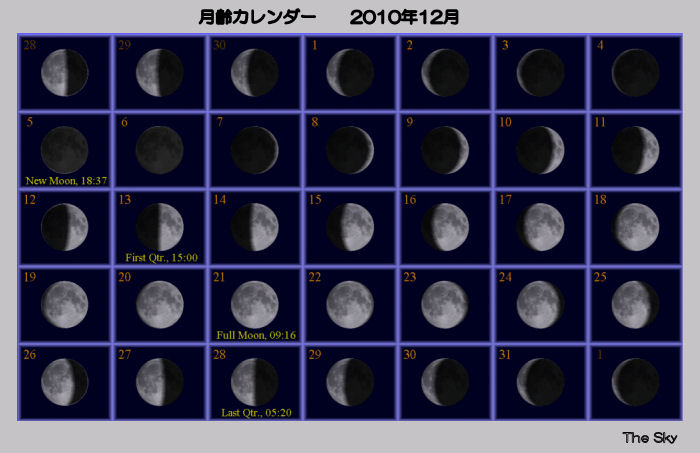 4日7時 金星が最大光度(−4.9度)**必見** 13日23時 木星が月に接近(日、高度15度、間隔7.2度) 21日 皆既月食**必見** 22日 冬至