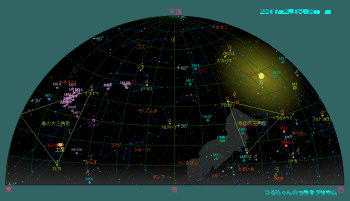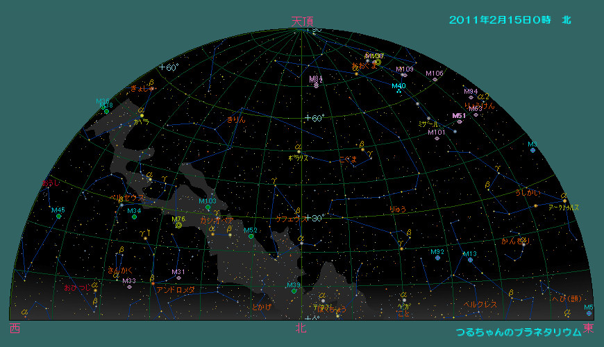 2月の空は秋の星座はアンドロメダ座とペルセウス座のみを残し、既に冬の星座で一杯です。北の空のおおぐま座は高度を増し、カシオペア座は地平線に近づいていきます。南の空はオリオン座、天頂にはふたご座やおうし座の明るい星々が輝きます。東の空には春の星座を代表するしし座やかに座が上ってきています。