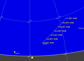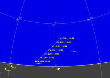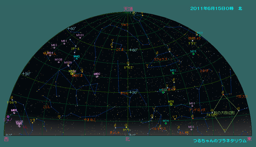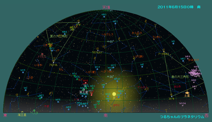 6月の夜空がすっかりおとなしい春の星座に入れ替わりました。牛かい座が南の空高く昇り、北斗七星が北の空高く、カシオペア座が地平線すれすれに見えています。西の空には春の星座を代表するしし座が傾き、その近くには土星が輝いています。南西にはおとめ座が見えています。夜半になると夏の星座が昇ってきます。さそり座、いて座、白鳥座、こと座、わし座などの明るい星座が夜空が飾ります。中央ヨーロッパから見るとさそり座も地平線を這う様に動きます。さそり座といて座の間には天の川銀河の中心部有り、その周りには沢山の星雲星団が有ります。アンドロメダ座のアンドロメダ大銀河(M31)、ペルセウス座の2重星団(h-χ、エイチ・カイと読む)と散開星団(M34)も夜明け前に東の空に昇り、ゆっくり観望出来る時期になりました。これらの星雲星団は双眼鏡が有れば十分です。かみのけ座銀河団も見ごろですので、お忘れなく。