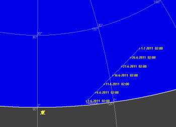 又この時期は夜光雲の季節でも有ります。夜光雲はオーロラの様にアレート情報が有りませんので、毎日注意して夜空を観望するか、独流星研究会大気光学部門のBBSをこまめにチェックして下さい。このBBSは情報の速さではぴか一です。
