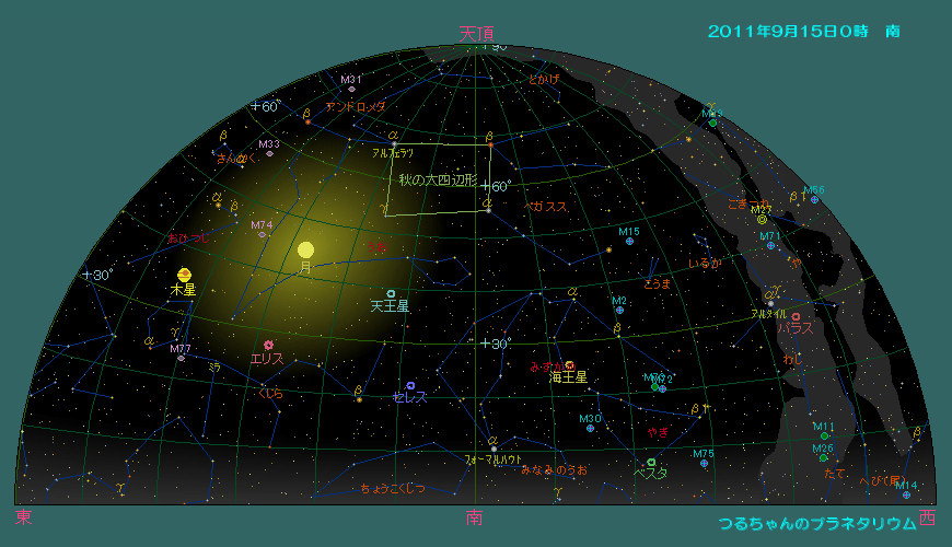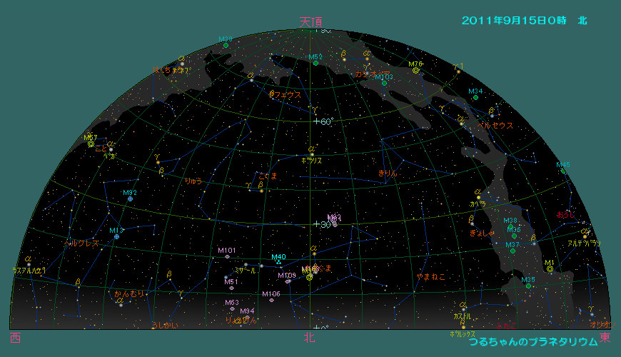 南西の空にはいて座とさそり座付近の星雲星団群(M4、6、7、8、20、22)、アンドロメダ座のアンドロメダ大銀河(M31)、ペルセウス座の2重星団(h-χ、エイチ・カイと読む)と散開星団(M34)、ヘルクレス座の散開星団(M13)、へび座の散開星団(M5)と見ものは一杯。