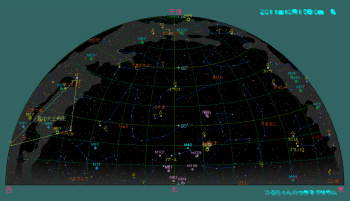 宵の空には西に傾いた夏の三角形を構成すること座(ベガ)、白鳥座(デネブ)、わし座(アルタイル)等の夏の星座が空を占領していますが、すっかり暗くなる頃には秋の四辺形(ペガスス座)、カシオペア座も天頂付近迄昇ります。アンドロメダ大星雲(M31)も見ごろです。北斗七星はひしゃくを上に向けて北の空低く寝そべっています。高緯度で見る大熊座は一年中地平線の下に沈みません。低い南の空には秋の星座で唯一の一等星(フォーマルハウト)を持つみなみのうお座が見えます。東にはペルセウス座が高く上り、低い空にはぎょしゃ座のカペラが目立つようになります。このカペラも一年中地平線下に沈みません。夜半過ぎにはプレアデス星団、ヒアデス星団を抱えるおうし座に続いて双子座やオリオン座等の賑やかな冬の星座が昇ってきます。これらの星団は双眼鏡で十分観望出来ます。