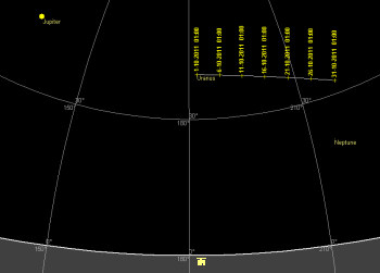 海王星 衝を後にした海王星の出は更に早くなり、夜半前ならば観望出来ます。大変くらい星なので、観望には望遠鏡が必要です。