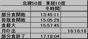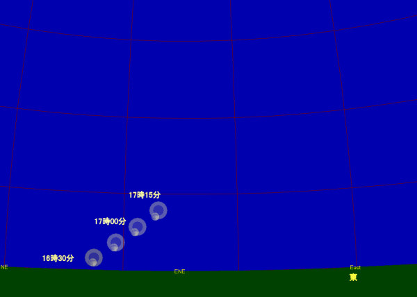 12月10日に夜皆既月食が起こります。 皆既食直後に月が昇るので、真っ赤な皆既食は観望できません。地平線が晴れていれば東の空で欠けた月が昇ってくるのが観望出来ます。 皆既食が見えないのは残念ですが、土曜日の夜でしかも時間帯も悪くありませんので、是非見て下さい。 以下、観望用データです。