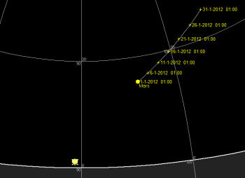 火星 出が次第に早くなる火星は、ほぼ一晩中観望できるようになります。光度も-0.5等迄明るくなります。