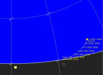 冥王星 先月29日に合となった冥王星の出は早くなりますが、大変暗い星なので観望は難しいでしょう。