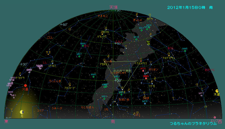 今月のハイライトは特にありませんが、4日朝に極大を迎えるしぶんぎ座流星群は火球も飛ばす活発な流星群ですので、観望の価値はあります。月が有り条件は良くありませんが、月が沈んだ明け方頃に観望して下さい。