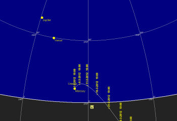 今月は金星が夕方の南西の空で更に高度を上げ、宵の空でもっとも明るい星として輝きます。13日には木星と3度迄近づき、天空でもっとも明るい星が二つ並んでいるのが観望出来ます。火星と土星は一晩中観望出来ます。水星は上旬で有れば日没後の僅かな時間のみ観望出来ます。