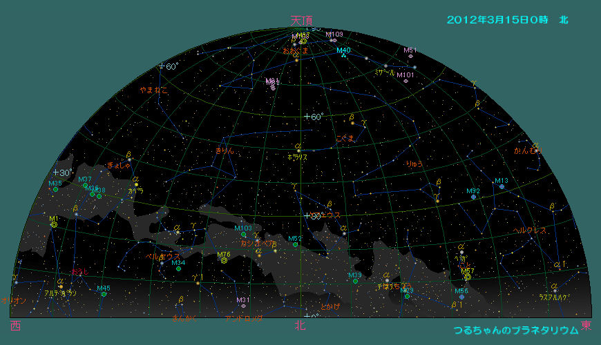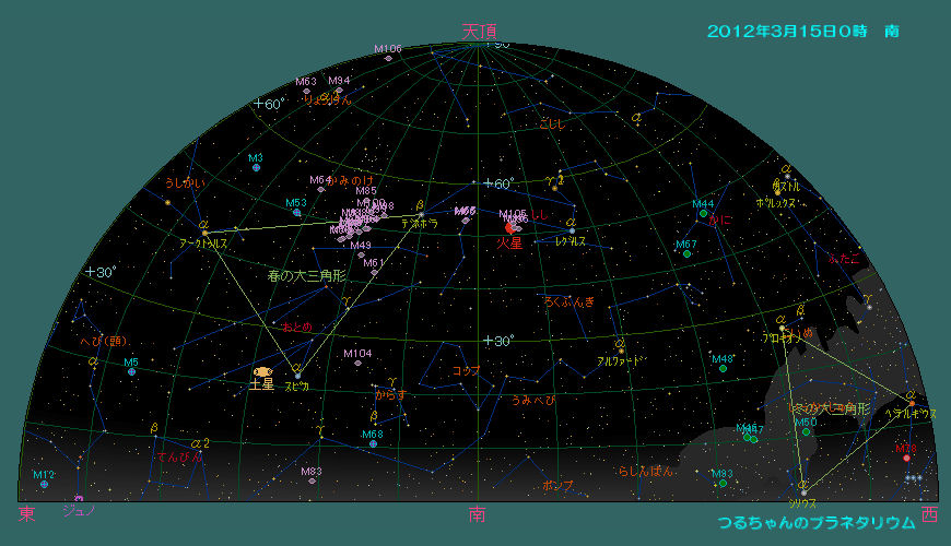 星空の方は、3月になるとコップ座、おとめ座、からす座などのおとなしい春の星座が東の空に昇ります。