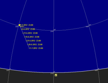 6月の夜空がすっかりおとなしい春の星座に入れ替わりました。牛かい座が南の空高く昇り、北斗七星が北の空高く、カシオペア座が地平線すれすれに見えています。西の空には春の星座を代表するしし座が傾き、その近くには土星が輝いています。南西にはおとめ座が見えています。夜半になると夏の星座が昇ってきます。さそり座、いて座、白鳥座、こと座、わし座などの明るい星座が夜空が飾ります。中央ヨーロッパから見るとさそり座も地平線を這う様に動きます。さそり座といて座の間には天の川銀河の中心部有り、その周りには沢山の星雲星団が有ります。アンドロメダ座のアンドロメダ大銀河(M31)、ペルセウス座の2重星団(h-χ、エイチ・カイと読む)と散開星団(M34)も夜明け前に東の空に昇り、ゆっくり観望出来る時期になりました。これらの星雲星団は双眼鏡が有れば十分です。かみのけ座銀河団も見ごろですので、お忘れなく。