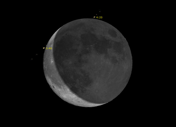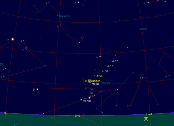 7月15日の明け方に月による木星食が見られます。 食直前に月が昇り、空は明るくなりますが、欧州からは全行程観望する事が出来ます。 地平線に近い所で起こる天体現象ですので、見晴らしの良い場所で観望して下さい。 以下、観望用データです。
