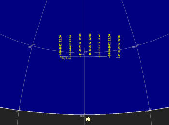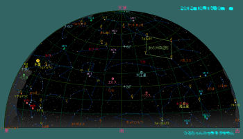 宵の空には西に傾いた夏の三角形を構成すること座(ベガ)、白鳥座(デネブ)、わし座(アルタイル)等の夏の星座が空を占領していますが、すっかり暗くなる頃には秋の四辺形(ペガスス座)、カシオペア座も天頂付近迄昇ります。アンドロメダ大星雲(M31)も見ごろです。北斗七星はひしゃくを上に向けて北の空低く寝そべっています。高緯度で見る大熊座は一年中地平線の下に沈みません。低い南の空には秋の星座で唯一の一等星(フォーマルハウト)を持つみなみのうお座が見えます。東にはペルセウス座が高く上り、低い空にはぎょしゃ座のカペラが目立つようになります。このカペラも一年中地平線下に沈みません。夜半過ぎにはプレアデス星団、ヒアデス星団を抱えるおうし座に続いて双子座やオリオン座等の賑やかな冬の星座が昇ってきます。これらの星団は双眼鏡で十分観望出来ます。