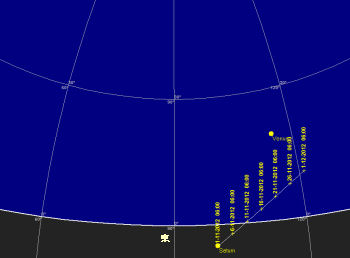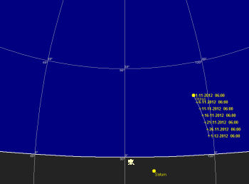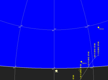 土星 先月25日に合となった土星は出が早くなり、夜明け前の東の空で観望出来ます。27日の早朝には金星とのランデブーが観望出来ます。