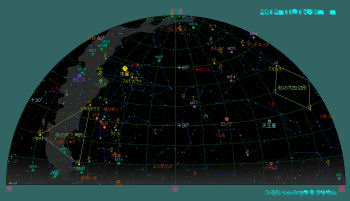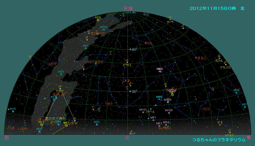 今月の星空は秋の星座で一杯です。天の川はちょうど西から東へを天を横切ります。アンドロメダ座と秋の四辺形(ペガスス座)が天頂に、白鳥座、わし座、こと座などの夏の大三角を形作る星座が西の空に、東からはプレアデス星団(M45)、ヒアデス星団を抱えるおうし座、ふたご座、オリオン座、おおいぬ座等のにぎやかな冬の星座が昇ってきます。大きな5角形のぎょしゃ座も目に付きます。北斗七星は北の空低くひしゃくを上にして横たわりカシオペア座は天頂近くまで高度を昇ります。南には目立たない星座が多い中、秋の星で唯一の一等星フォーマルハウトが地平線低く輝いています。