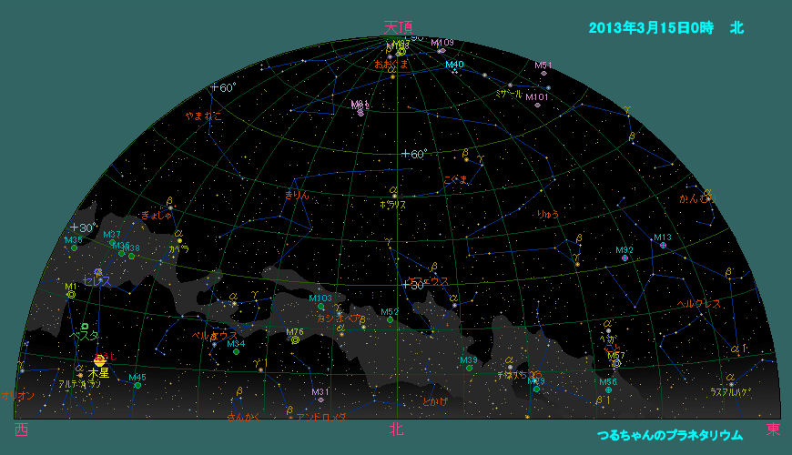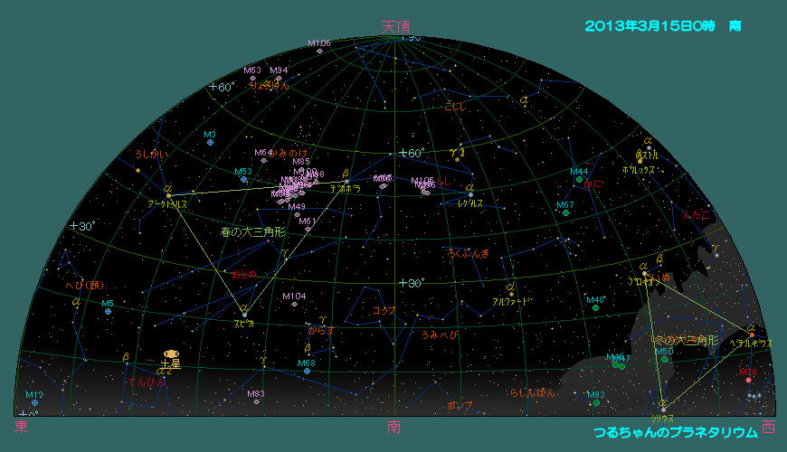 星空の方は、3月になるとコップ座、おとめ座、からす座などのおとなしい春の星座が東の空に昇ります。