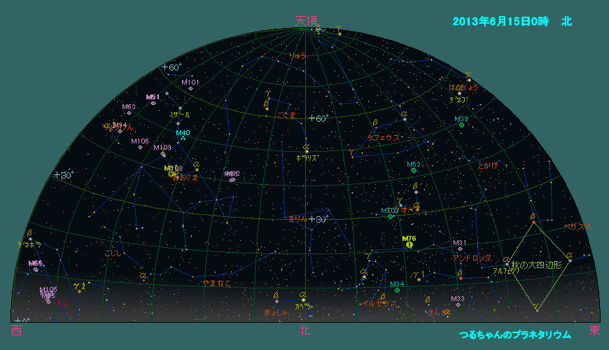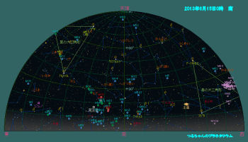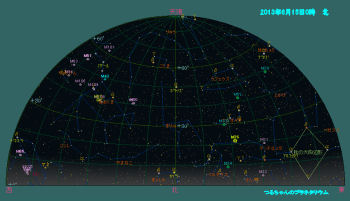 6月の夜空がすっかりおとなしい春の星座に入れ替わりました。牛かい座が南の空高く昇り、北斗七星が北の空高く、カシオペア座が地平線すれすれに見えています。西の空には春の星座を代表するしし座、南西にはおとめ座が見えています。夜半になると夏の星座が昇ってきます。さそり座、いて座、白鳥座、こと座、わし座などの明るい星座が夜空が飾ります。