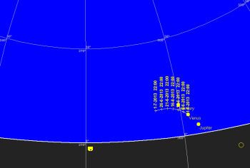 木星が西に傾き、金星も未だ目立ちません。土星はかろうじて暗くなる夜空で観望出来ます。水星も火星も太陽に近く、観望は難しいですが、今月一杯金星と水星が未だ明るい夕方の空で並んでいるのが見えます。