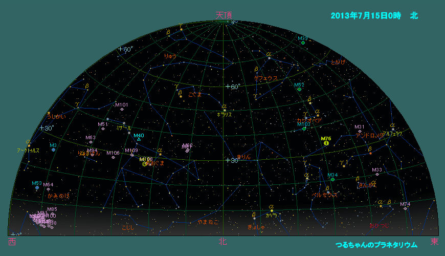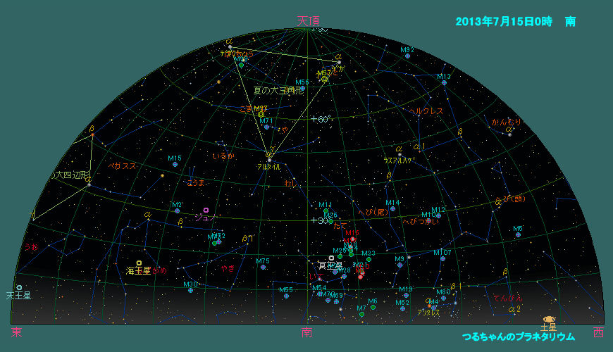 いて座とさそり座付近の星雲星団群(M4、6、7、8、20、22)、アンドロメダ座のアンドロメダ大銀河(M31)、ペルセウス座の2重星団(h-χ、エイチ・カイと読む)と散開星団(M34)、ヘルクレス座の散開星団(M13)、へび座の散開星団(M5)と見ものは一杯。
