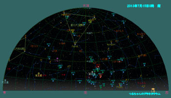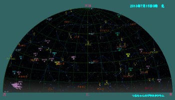 夜空も夏の星座に入れ替わりました。東の空には白鳥座のデネブ、こと座のベガ、ワシ座のアルタイルで構成される夏の大三角が見えています。うしかい座とおとめ座が西に傾きました。南の低いところにはさそり座の頭が見えています。天頂にはヘラクレス座の大きな四角が、その南にはへびつかい座が大きく広がっています。北の空高くにりゅう座が横たわり、おおぐま座は西に傾き、北極星をはさんだ北東の空にカシオペア座が高度をあげてきました。北の空低い所にはぎょしゃ座のカペラが見えています。カペラは高緯度のドイツでは一年中地平線下に沈まない周極星になっています。