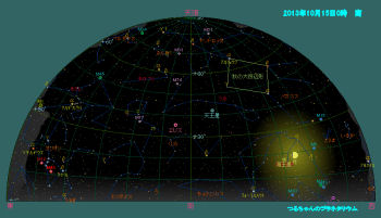 宵の空には西に傾いた夏の三角形を構成すること座(ベガ)、白鳥座(デネブ)、わし座(アルタイル)等の夏の星座が空を占領していますが、すっかり暗くなる頃には秋の四辺形(ペガスス座)、カシオペア座も天頂付近迄昇ります。アンドロメダ大星雲(M31)も見ごろです。北斗七星はひしゃくを上に向けて北の空低く寝そべっています。高緯度で見る大熊座は一年中地平線の下に沈みません。低い南の空には秋の星座で唯一の一等星(フォーマルハウト)を持つみなみのうお座が見えます。東にはペルセウス座が高く上り、低い空にはぎょしゃ座のカペラが目立つようになります。このカペラも一年中地平線下に沈みません。夜半過ぎにはプレアデス星団、ヒアデス星団を抱えるおうし座に続いて双子座やオリオン座等の賑やかな冬の星座が昇ってきます。これらの星団は双眼鏡で十分観望出来ます。