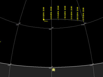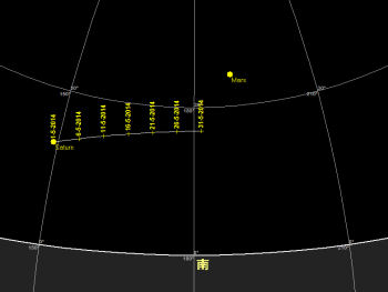 10日19時 土星が衝 11日22時 火星が月に接近(南東、高度30度、間隔5.6度) **必見** 14日21日 土星が月に接近(東、高度10度、間隔5.4度) **必見** 25日5時 金星が月に接近(東、高度15度、間隔5.7度) **必見**