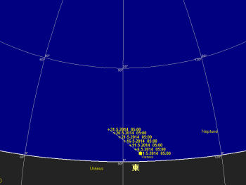 海王星 2月23日に合となった海王星は次第に太陽から離れるが、薄明が早い為見つけるのは大変難しい。