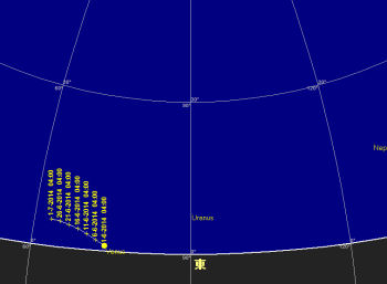 天王星 太陽から次第に離れる天王星は、中旬頃から夜明け前の東の空で見え出す。