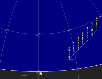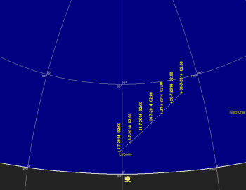 金星 金星は出が遅くなり、明るい空では目立たないが、未だ明けの明星として東の空で観望可能。光度は-3.9等へ下がる。日照面は90%。