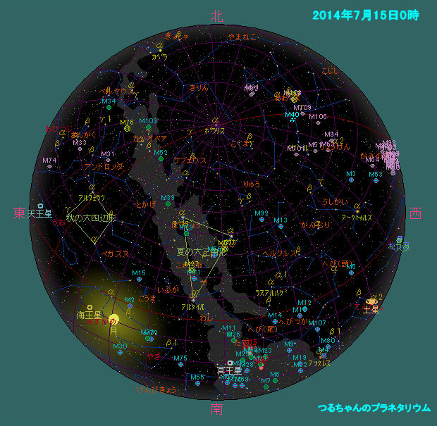 4日 地球が遠日点を通過(15.2093億km) 4日 冥王星が衝 5日23時 火星が月に接近(南西、高度15度、間隔2.2度) **必見** 8日0時 土星が月に接近(南西、高度15度、間隔0.4度) **必見** 12日 水星が西方最大離隔 24日 木星が衝