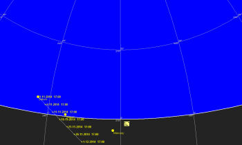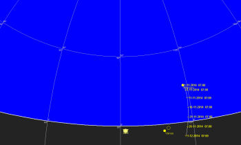 水星 今月の水星は月初迄は夜明け前の東の空でかろうじて観望可能。光度は-0.6等。