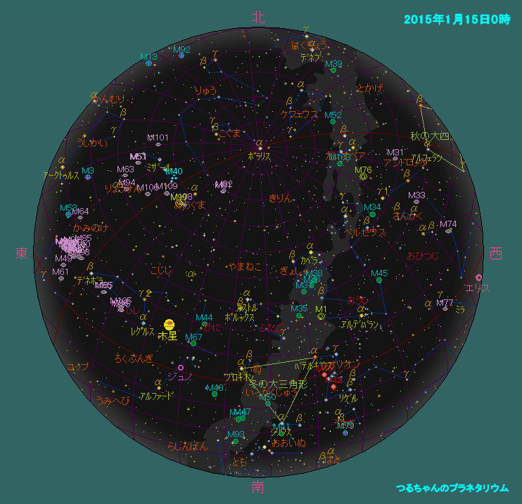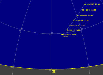 木星 2月15日に衝となる木星は出が早くなり、ほぼ一晩中観望。光度は-2.6等。