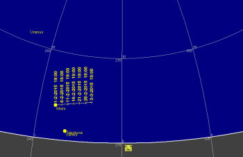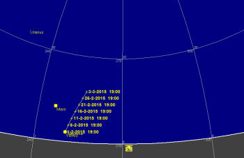 金星 金星は没が遅くなり、夕方高度を上げてくる。今月は南西の空で観望可能。今月は火星と接近する。