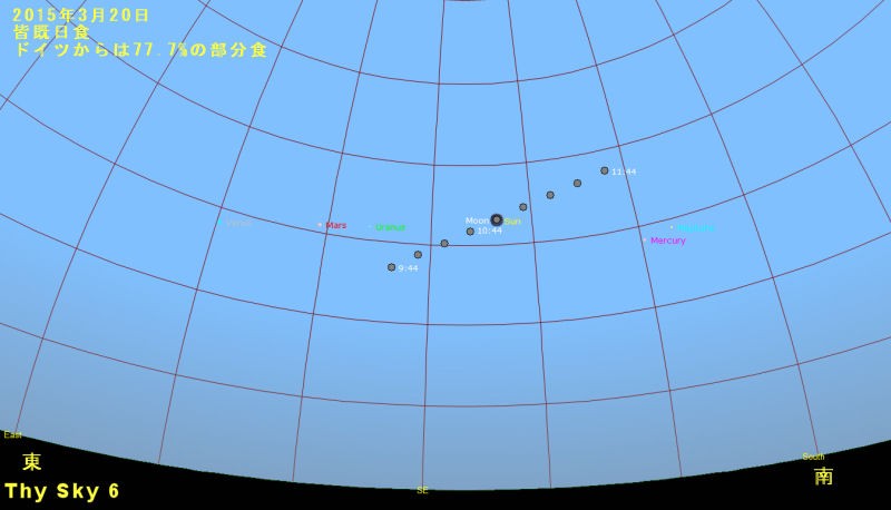 日付 時刻 3 3 木星が月に接近(西、高度15度、間隔 5.2度) 4 18 金星と天王星が接近(西、高度10度、間隔0.1度)**必見** 5 7 月が遠地点を通過 5 18 満月 9 1 スピカと月が接近(南、高度30度、間隔 3.3度) 11 16 火星と天王星が接近(西、高度25度、間隔 0.3度) 12 7 土星が月に接近(南西、高度5度、間隔 2.2度) 13 17 下弦 14 21 土星が留 19 19 月が近地点を通過 20 9 新月 20 皆既日食(欧州から観望可能)**必見** 21 18 火星が月に接近(西、高度5度、間隔 0.9度)**必見** 22 19 金星がつきに接近(西、高度5度、間隔 2.7度) 25 7 アルデバランと月が接近(東北東、高度5度、間隔 0.9度)**必見** 27 7 上弦 31 18 レグルスと月が接近(南西、高度45度、間隔 3.8度)