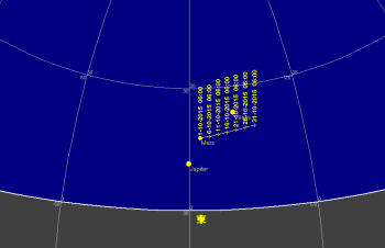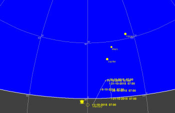 日付 時刻 イベント 9-11 5 金星、火星、木星、月のランデブー(東、高度10度)**必見** 12 天王星が衝 13 新月 16 10 水星が西方最大離隔(18) 16 19 土星 が月に接近(西、高度15度、間隔2.4度)**必見** 18 5 火星と木星が接近(東、高度15度、間隔0.4度)**必見** 23 17 海王星が月に接近(南東、高度20度、間隔2度)**必見** 26 5 金星と木星が接近(東、高度10度、間隔1度)**必見** 26 8 金星が西方最大離隔 26 13 月が近地点を通過 27 12 満月