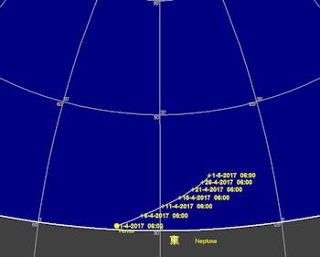 日付 時刻 イベント 1日 水星が東方最大離隔 7日 木星が衝 10日 23時 木星が月に接近(南、高度30度、間隔1.4度) 14日 天王星が合 17日 1時 土星が月に接近(南西、高度10度、間隔4度) 20日 水星が内合 30日 金星が最大光度(-4.8等)