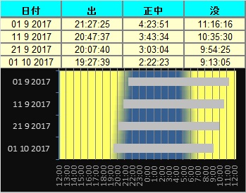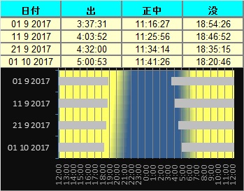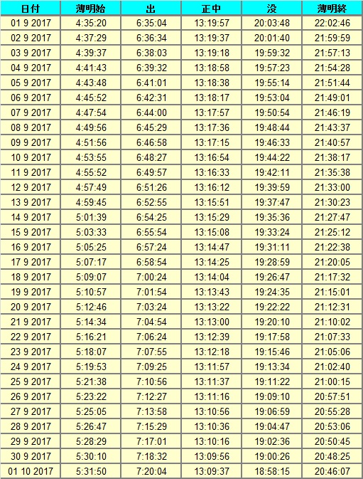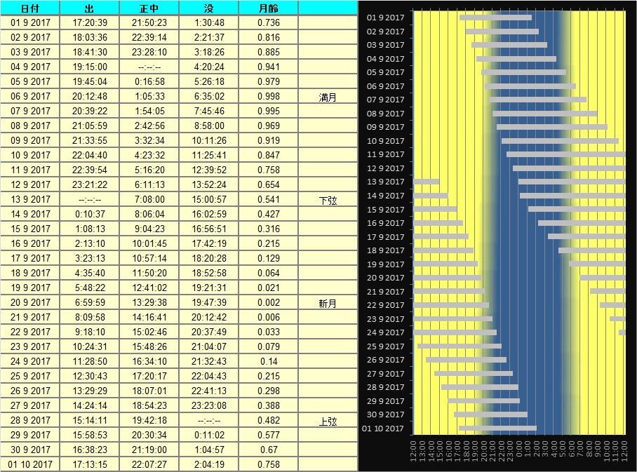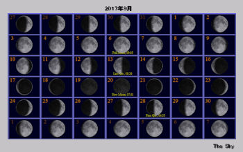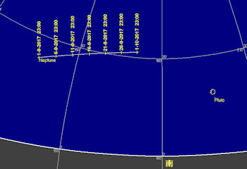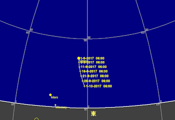 日付 時刻 イベント 5 海王星が衝 12 水星が西方最大離隔 13-30 6 水星、金星、火星、月のランデブー(東、高度15度) 17 5 水星と火星が接近(間隔0.3度) 18 4 金星が月に接近(間隔0.5度) 19 5 水星と月が接近(間隔3.2度) 22 19 木星が月に接近(西、高度10度、間隔4.6度) 22 秋分 26 21 土星が月に接近(南、高度15度、間隔3.7度)