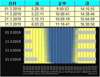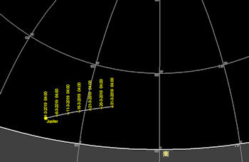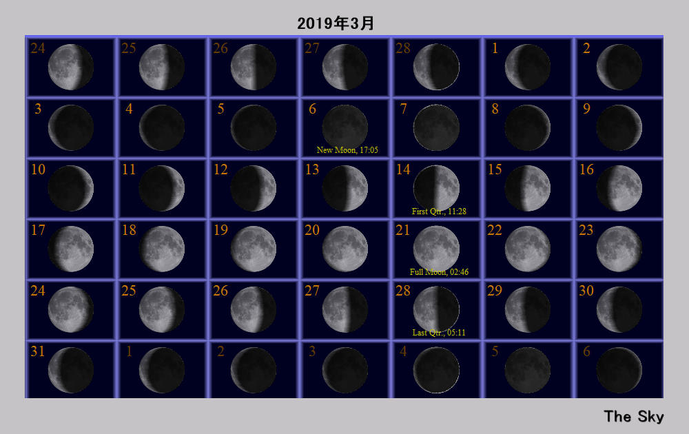日付 時刻 方角 高度(度) イベント 2-3 6 南東 10 金星、土星が月に接近 7 海王星が合 11 20 西 30 火星が月に接近(間隔6度) 20 春分 27 3 南東 10 木星が月に接近(間隔1.1度) 29 5 南東 15 土星が月に接近(間隔0.9度)