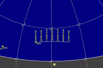 日付 時刻 方角 高度(度) イベント 4 21 西 15 水星が月に接近(4.5度) 5 22 西 20 火星が月に接近(3.6度) 10 木星が衝 10-25 21 西 水星と火星のランデブー 16 21 南東 5 木星が月に接近(1.5度) 18 21 西 15 水星と火星が接近(0.2度) 19 3 南東 1.8度 土星が月に接近(1.8度) 21 夏至 24 水星が東方最大離隔