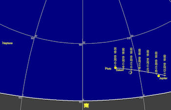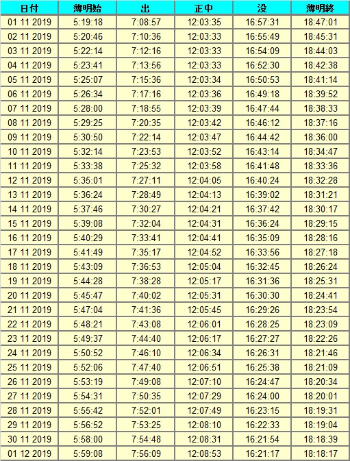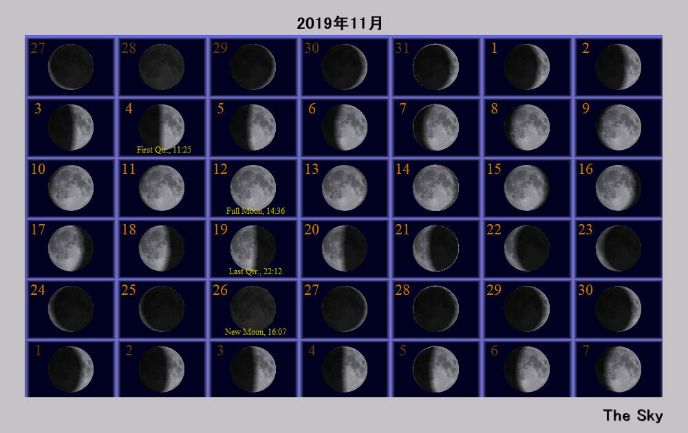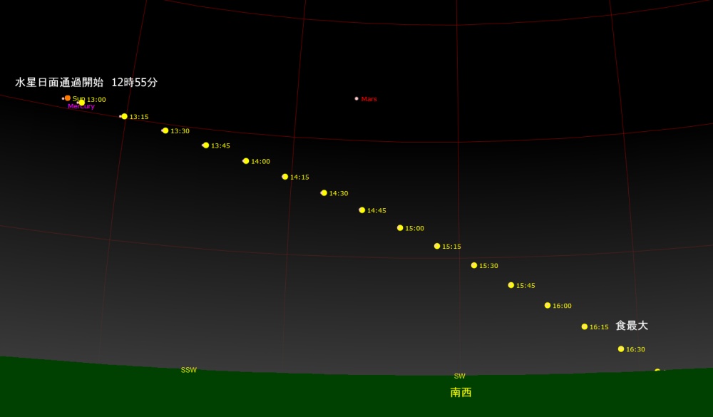 日付 時刻 方角 高度 イベント 2日 18時 南 15度 土星が月に接近 11日 16時15分 南西 水星日面通過 17日 しし座流星群が極大 24日 6時 東 10度 火星が月に接近(間隔4.7度) 24日 17時 南西 5度 木星と火星が接近(間隔1.4度) 25日 7時 南東 10度 水星が月に接近 28日 11時 南東 10度 木星が月に接近(掩蔽)(間隔0.1度) 28日 17時 南西 5度 金星が月に接近(間隔2.2度) 29日 18時 南西 5度 土星が月に接近(間隔3.2度)