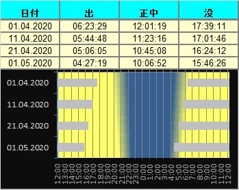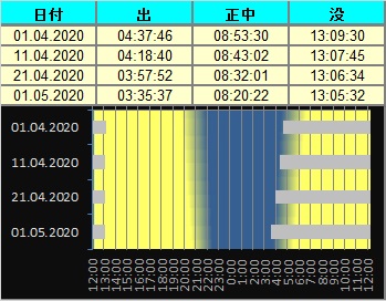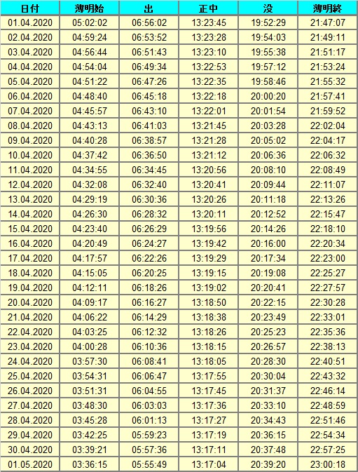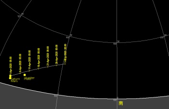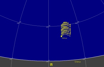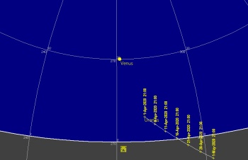日付 時刻 方角 高度(度) イベント 4 西 20 金星とプレアデス星団が接近 15.03.-15.04. 5 南東 15 木星、土星、火星のランデブー 26 天王星が太陽と合 28 金星が最大光度(-4.8度)
