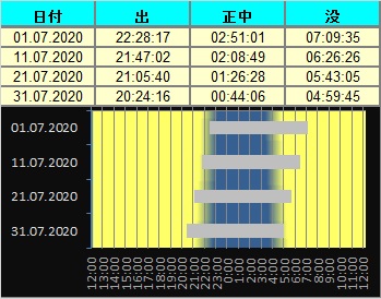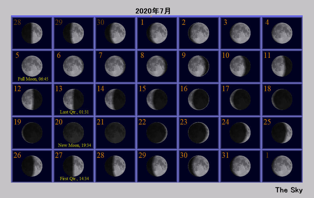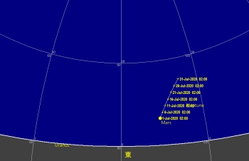 日付 時刻 方角 高度(度) イベント 4 地球が遠日点を通過 5 5:30 半影食 5-6 23 南東 10度 木星、土星、月が接近 10 金星最大光度 10- 23 北 彗星ネオワイズが見ごろ 12 1 東 10度 火星が月に接近(間隔2.8度) 14 木星が衝 15 冥王星が衝 17 4 東 15度 金星が月に接近(2.6度) 20 土星が衝 22 水星が西方最大離隔