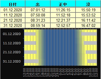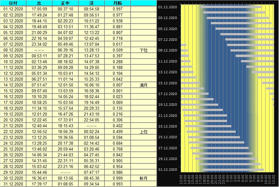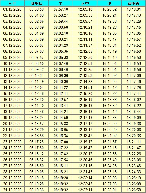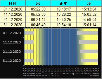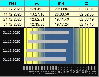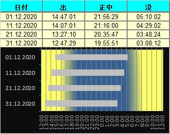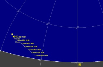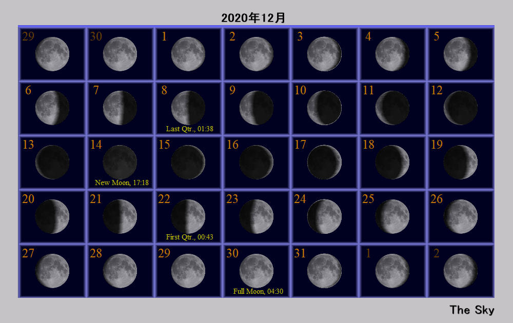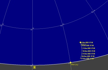 日付 時刻 方角 高度(度) イベント 13 7 南西 10度 金星が月に接近(間隔5.8度) 14 ふたご座流星群極大 21 冬至 21 18 南西 10度 木星と土星が接近(間隔0.1度) 23 24 西 20度 火星が月に接近(間隔5.5度)