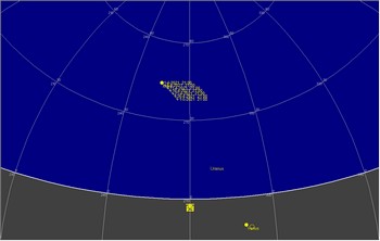 日付 時刻 方角 高度(度) イベント 6 6:00 南東 10度 土星が月に接近(5.7度) 7 6:00 南東 10度 木星が月に接近(5.8度) 17 20:00 西 50度 火星が月に接近(2.8度) 19 水星が外合 26 20:00 南東 15度 金星と水星が接近(1.5度) 30 天王星が合