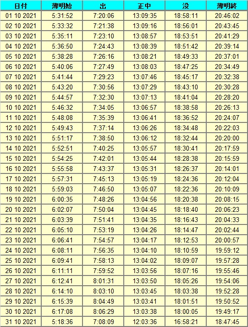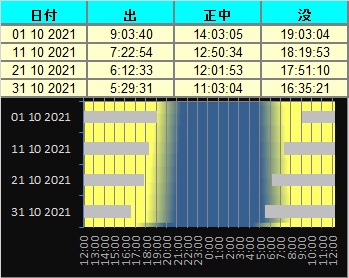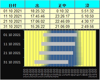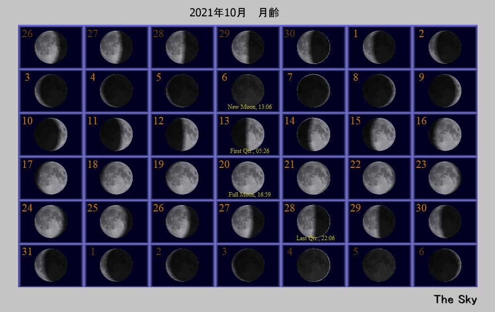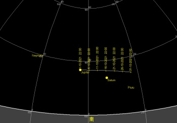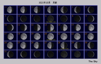 日付 時刻 方角 高度(度) イベント 8 ジャコビニ/りゅう座流星群が極大 9 18:00 西 15 金星が月に接近(2.6度) 15 18:00 南東 10 木星が月に接近(5.5度) 21 オリオン座流星群が極大 22 0:00 南東 45 天王星が月に接近(1.8度) 25 水星が西方最大離隔 29 金星が東方最大離隔