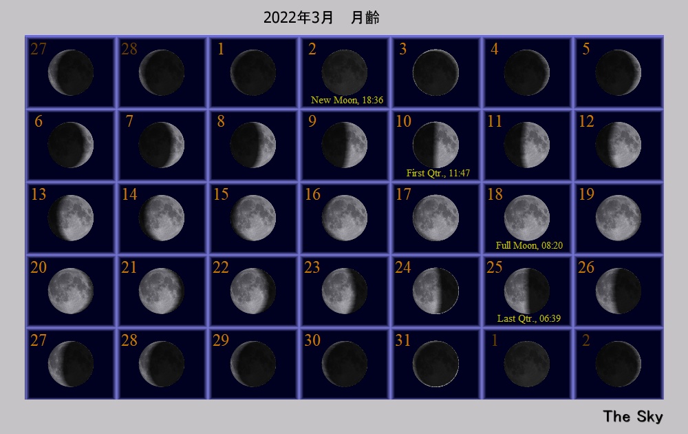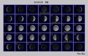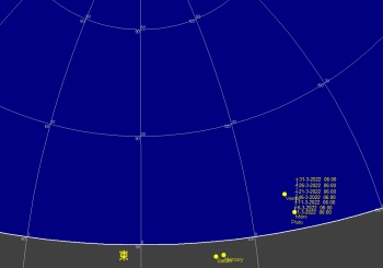 日付 時刻 方角 高度(度) イベント 8 0:00 西 15 月とプレアデス星団が接近 13 海王星が合 16 6 南東 10 金星と火星が接近(間隔3.9度) 20 春分 20 金星が東方最大離隔 23.03.-15.04. 6 南東 10 金星、土星、火星のランデブー 27 ドイツ夏時間開始 28 6 南東 10 金星、土星、火星と月のランデブー 29 5 南東 10 金星と土星が接近(間隔2.1度)