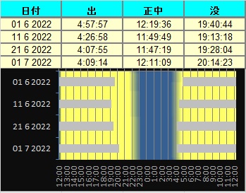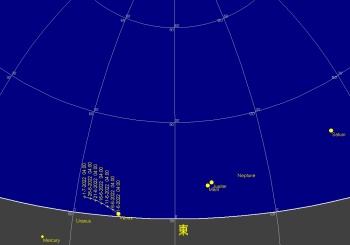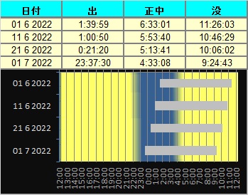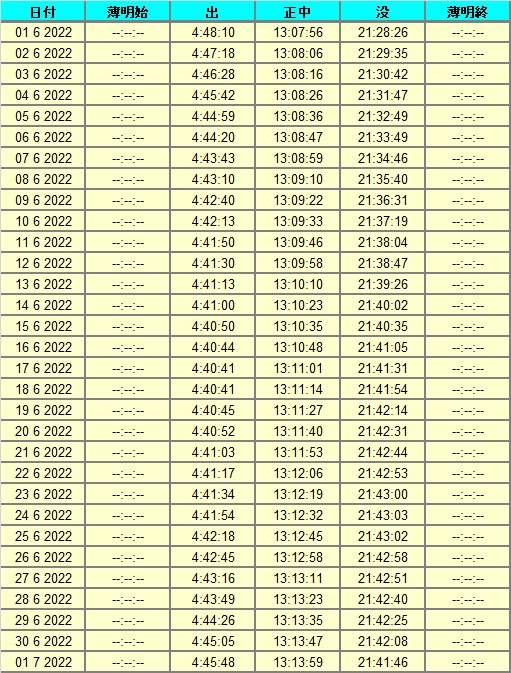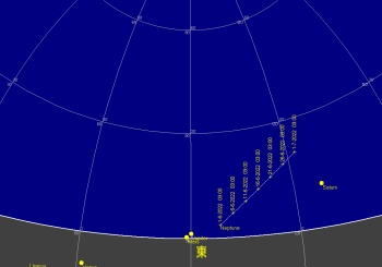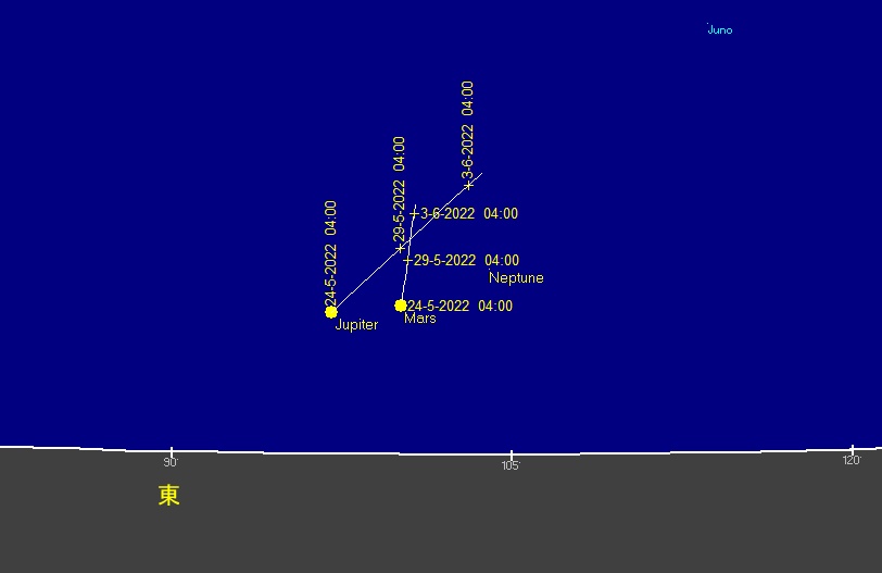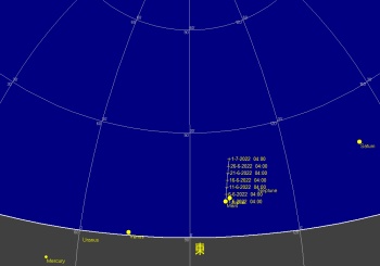 日付 時刻 方角 高度(度) イベント >24.5.-3.6. 4:00 東 10度 火星、木星、月のランデブー 12 4:00 東 5度 金星と天王星が接近(1.6度) 18 4:00 東 20度 土星が月に接近(4.3度) 21 夏至 21 2:00 東 5度 木星が月に接近(5.6度) 22 3:00 東 10度 火星が月に接近(3.6度) 26 4:00 東 5度 プレアデスと金星が月に接近 26-28 5:00 東 5度 金星と水星が月に接近