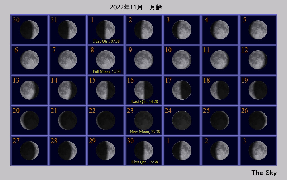 日付 時刻 方角 高度(度) イベント 1 23:00 西 15 土星が月に接近(間隔4.8度) 5 0:00 西 30 木星が月に接近(間隔2.6度) 8 皆既月食(欧州からは観望不可/日本では8時が最大) 9 天王星が衝 11 19:00 北東 10 火星が月に接近(間隔3.4度) 18 0:00 しし座流星群極大