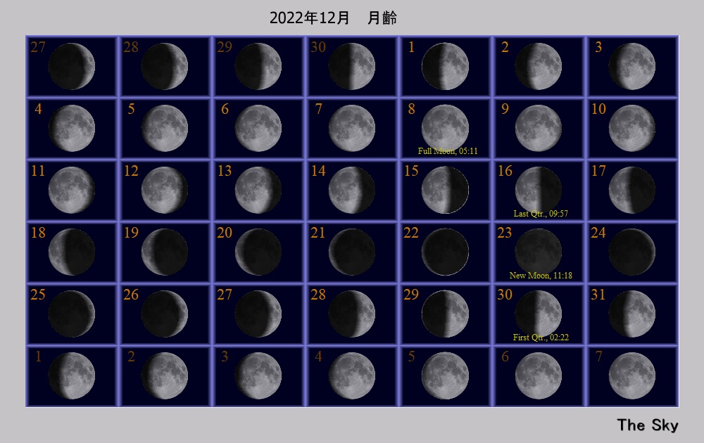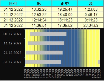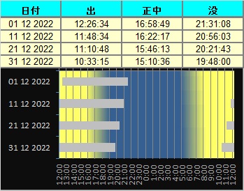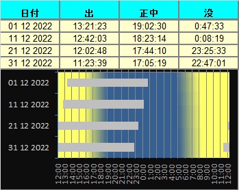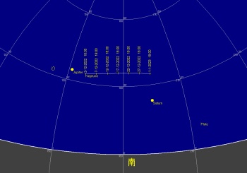 日付 時刻 方角 高度(度) イベント 1 火星が地球に接近(8200万km) 2 1:00 西 15 木星が月に接近(間隔3.7度) 5 18:00 東 40 天王星が月に接近(掩蔽/間隔0.2度) 8 6:00 西 20 火星が月に接近(掩蔽/間隔0.2度) 8 火星が衝 14 14:00 ふたご座流星群が極大 21 水星が最大東方離隔 21 冬至 24 17:00 南西 10 金星と水星が月とランデブー 26 19:00 南西 15 土星が月に接近(間隔4.5度) 29 17:00 南西 10 火星と水星が接近(間隔1.5度)双眼鏡必須 29 17:00 南 40 木星が月に接近(間隔3.3度)